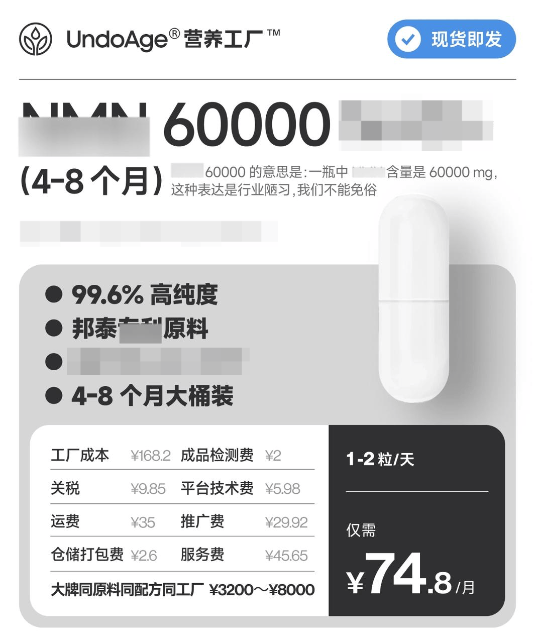 作为怕老怕死的两位中年男人,本身就是多年的保健品消费者,吃N某D+补剂吃得实在是钱包痛,于是他找到头部原料供应商和代工厂,看看能不能找到便宜一点的途径,一问才发现,原本一个月上千块的N某D+补剂,成本只需要两位数。