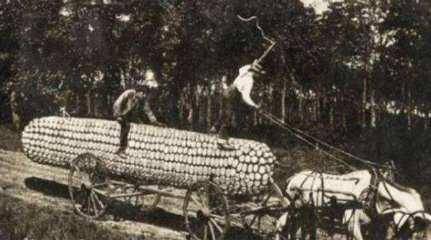 这是一张一百多年前美国的新闻照片,拍摄的时光让人不禁回想起那个时代曾盛行的浮夸风。照片里的这位先生,坐在一颗庞大的玉米上,看起来似乎是在做某种宣传。巨大的玉米象征着当时美国人对自身农业技术的夸张展示,尽管今天看来,这一幕显得颇为荒诞不经,却也充满了那个年代的特色。