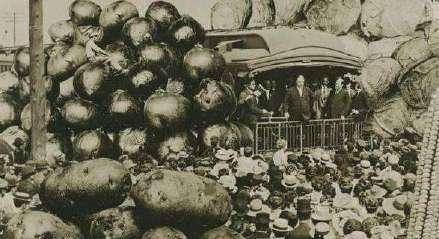 这张照片中的南瓜,或许正是我们熟知的冬瓜。无论它的真正品种如何,照片里的它都显得过于庞大,几乎让人怀疑它是否有那么大。如此逼真且巨大的南瓜,不禁让人感叹,那时候的人们到底是如何进行这些极限展示的。似乎每一张照片都在无声地讲述着那个时代浮夸风如何席卷美国,并成为他们展现国家实力的一种方式。